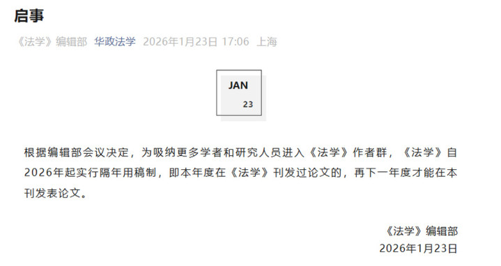 1月23日,由华东政法大学主办的学术期刊《法学》编辑部发布启事:根据编辑部会议决定,为吸纳更多学者和研究人员进入《法学》作者群,《法学》自2026年起实行隔年用稿制,即本年度在《法学》刊发过论文的,再下一年度才能在本刊发表论文。