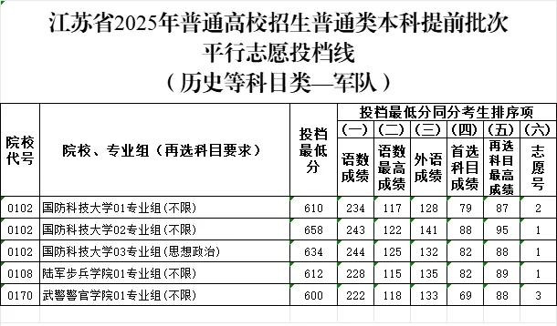军校提前批历史类只有三所大学招生,录取分数线最高的是国防科技大学02专业组658分,高于江苏特控线121分。录取最低的是武警警官学院01专业组600分,高于特控线63分。